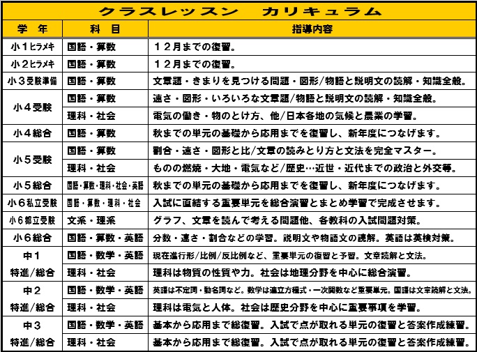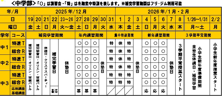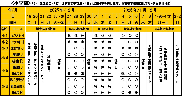 「○」は講習会・「特」は冬期集中特訓・「補」は補完学習(フリージム利用可)を表します。