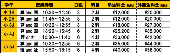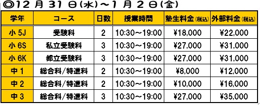 | ◆塾生は科目・単元・コマ数など、小中学生は1コマ(70分)\4,000(外部生\6,000)、高校生は1コマ(70分)\5,000(外部生¥8,000)で必要に応じて自由に組むことができます。 ◆12月19日(金)~1月6日(火)までの冬期講習会期間で、生徒1人1人の予定や必要量に応じてカウンセリングで組んでいきます。 |
