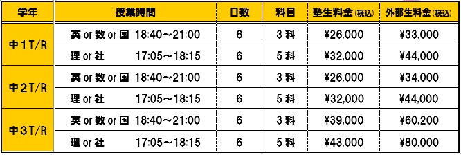 ※中1/中2の集中特訓は最も学習効果の高い『プログラム学習』のみになりますので、Tの生徒は全員必修となります。